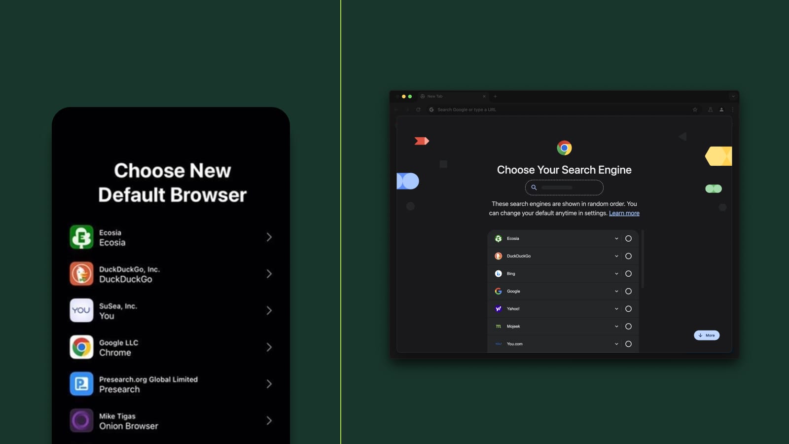 If you have an updated iPhone or use Chrome, you’ll see a choice screen over the next few weeks and months. This screen will give you the option to select your default search engine or browser: one that aligns with your values and preferences, rather than the preset default on your device.