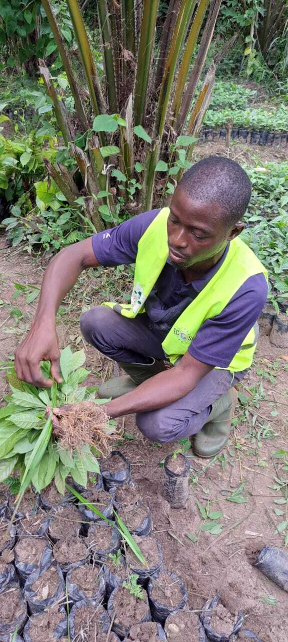 An APAF field officer prepares coffee seedlings for distribution to farmers; Delivering seedlings to plant in the rainy season can be challenging!