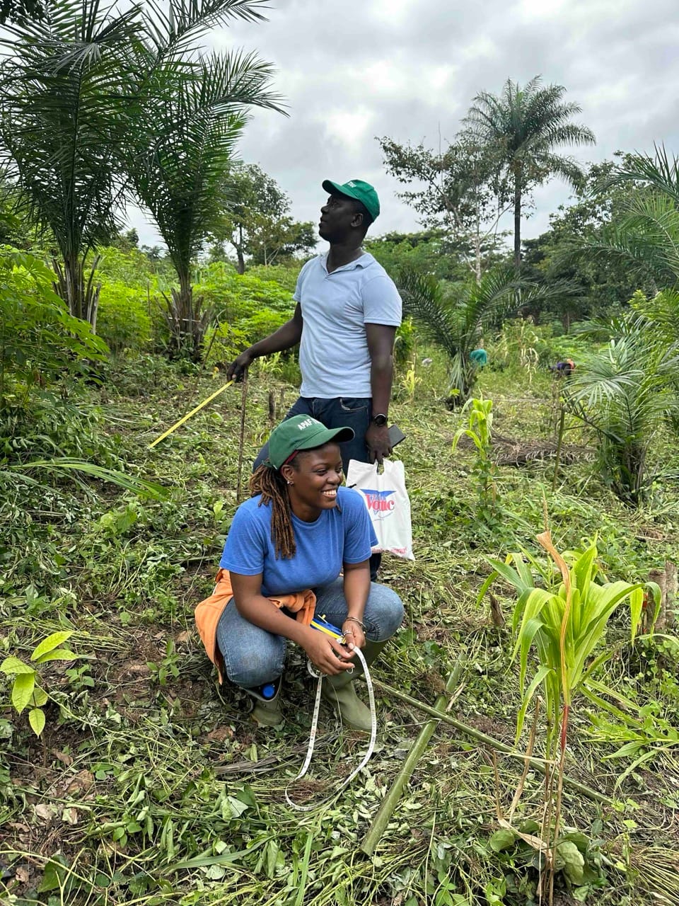 APAF staff monitoring a cocoa plot; A plot of cocoa trees