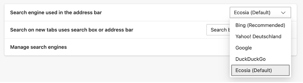 Next, scroll down to "Search engine" and select Ecosia.