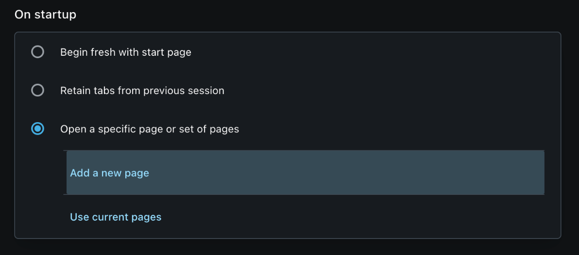 To get started, open Opera, then go to Preferences. Scroll down until you get to the section called On startup. Click the third option called Open a specific page or set of pages. Then click on Add a new page.