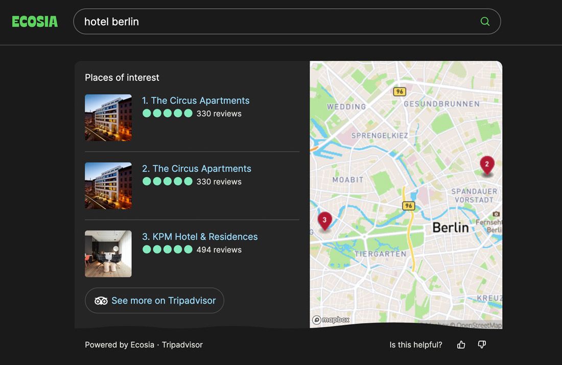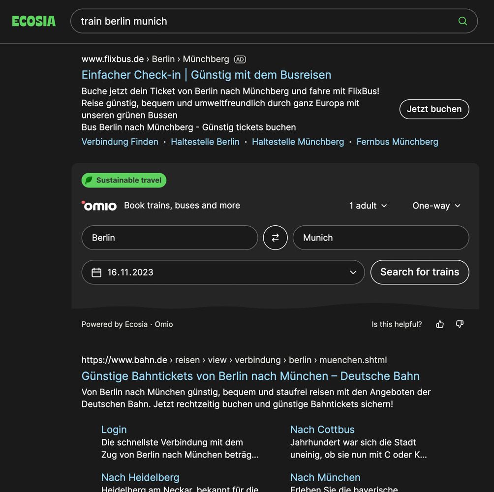 Thanks to your feedback, we’ve developed new rich search results. For instance, you can now book a train directly from Ecosia: