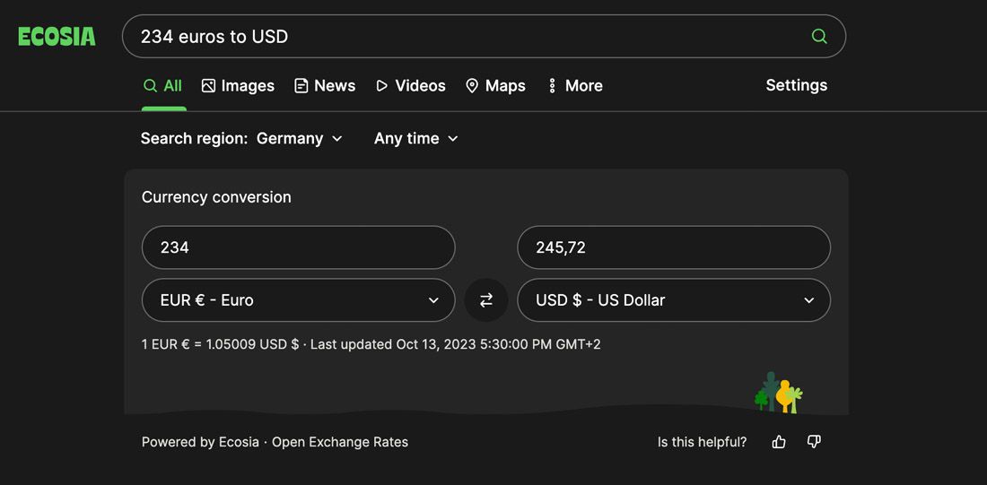 Don’t worry if a hotel lists their prices in a foreign currency. You can now convert currencies without leaving Ecosia: