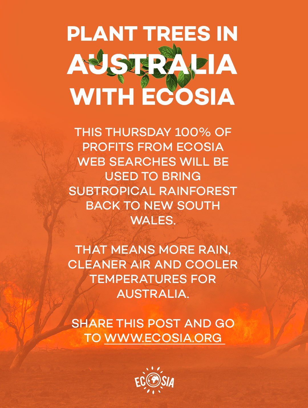 This emergency action will only work if we can get everyone on board. If you haven’t installed Ecosia yet, please do so. And please tell your friends and online followers that 100% of searches made on Thursday will plant trees in Australia. Feel free to share the poster below and use #ECOSIA4AUS to spread the word! On Thursday, just use Ecosia as you normally would.